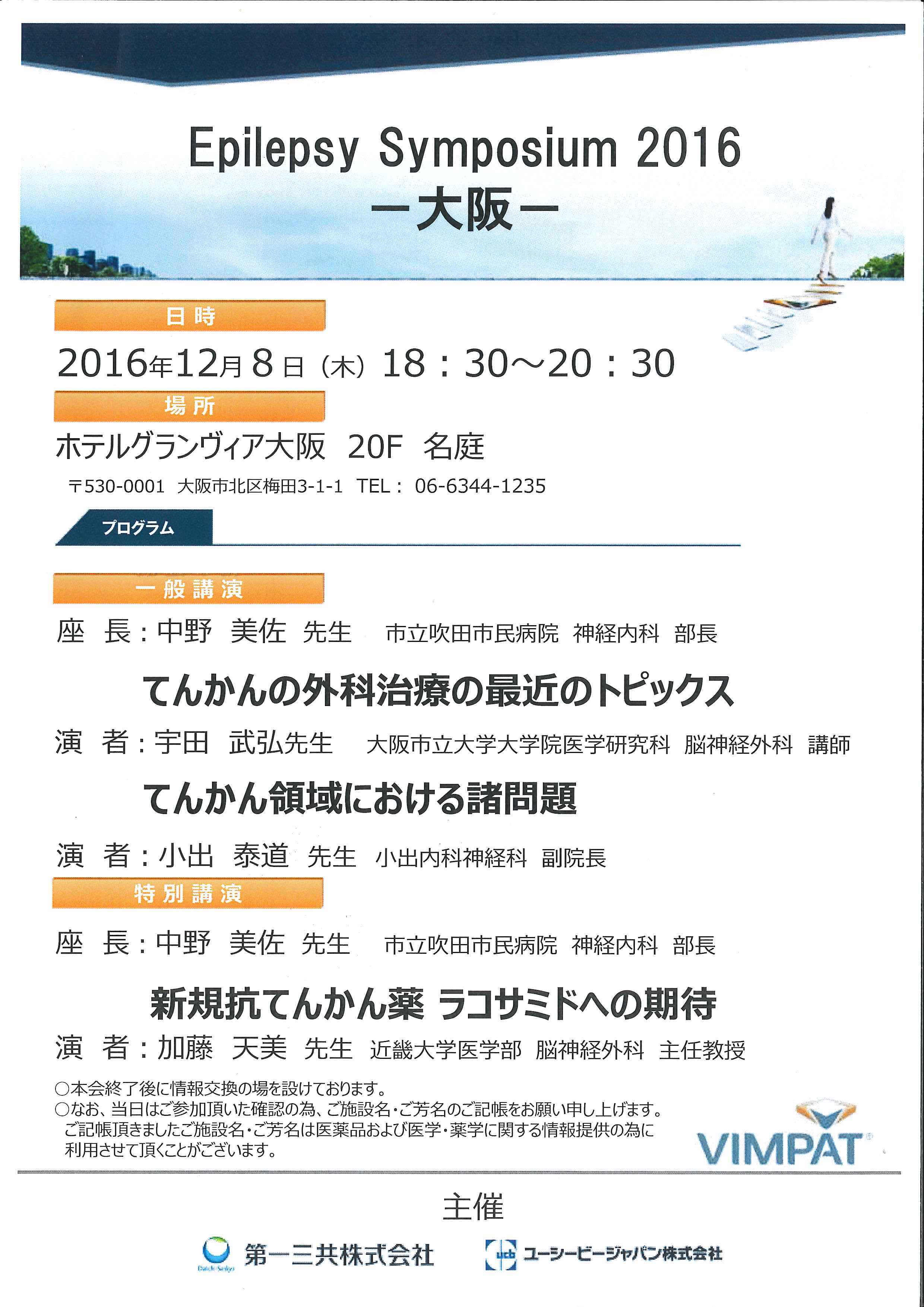 Epilepsy Symposium 2016 -大阪- 2016年12月8日 に Takehiro Uda が投稿 12月8日にホテルグランヴィア大阪で行われた「Epilepsy Symposium 2016」に参加し「てんかんの外科治療の最近のトピックス」について一般講演いたしました。また、「てんかん領域における諸問題 (小出泰道先生)」、「新規抗てんかん薬ラコサミドへの期待 (加藤天美先生」を拝聴し勉強させていただきました。ディスカッションも含めとても有意義な時間となりました。 Tweet