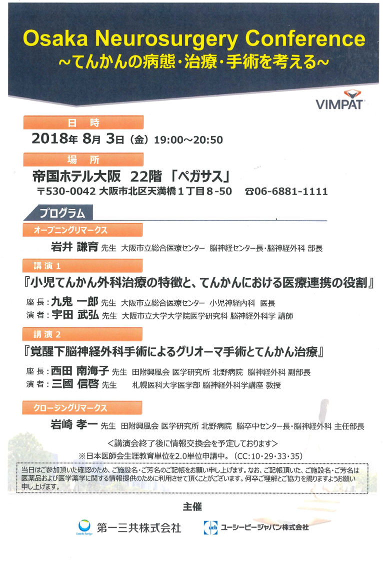 講演会「Osaka Neurosurgery Conference」 2018年8月10日 に Takehiro Uda が投稿 2018年8月3日に、帝国ホテル大阪にて開催された「Osaka Neurosurgery Conference」にて、「小児てんかん外科治療の特徴と、てんかんにおける医療連携の役割」と題した講演をさせていただきました。三國先生のご講演では、覚醒下手術とてんかん外科について沢山勉強させていただきました。 Tweet