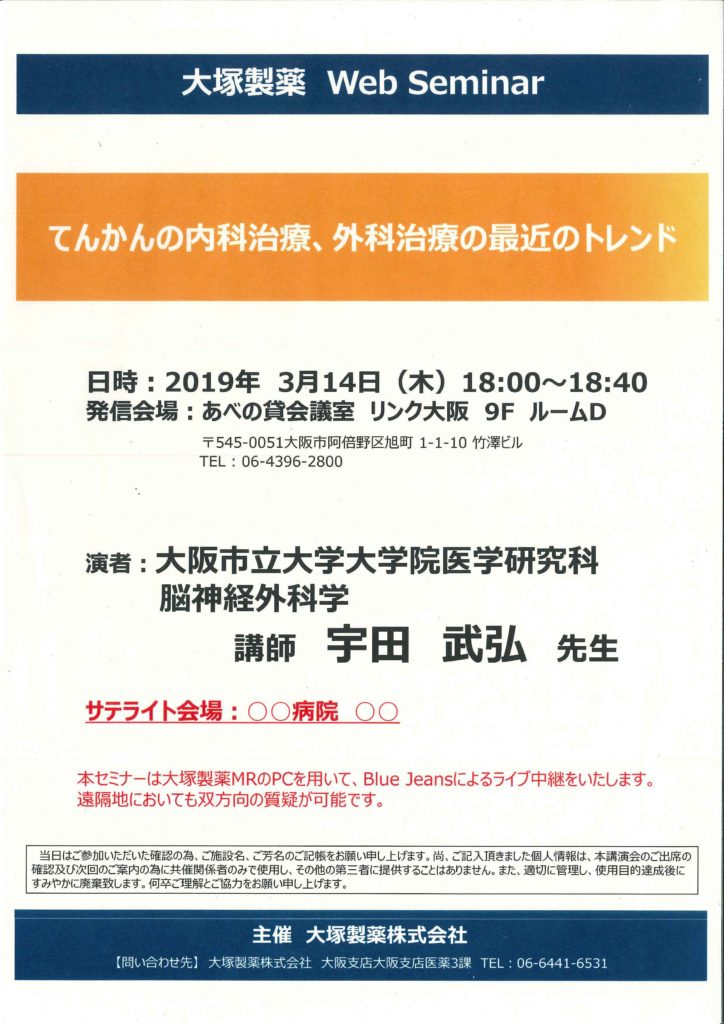 Web seminar てんかんの内科治療、外科治療の最近のトレンド 2019年2月13日 に Takehiro Uda が投稿 2019年3月14日に、大塚製薬Web Seminarが開催されました。今回は阿倍野の会議室とサテライト会場をBlue Jeansというシステムを用いてライブ中継でつなぎ、「てんかんの内科治療、外科治療の最近のトレンド」という題目でお話させていただきました。聞いていただく方の表情がわからないのが難点ですが、わざわざ会場に足を運ばなくてもよい今どきのスタイルでした。 Tweet