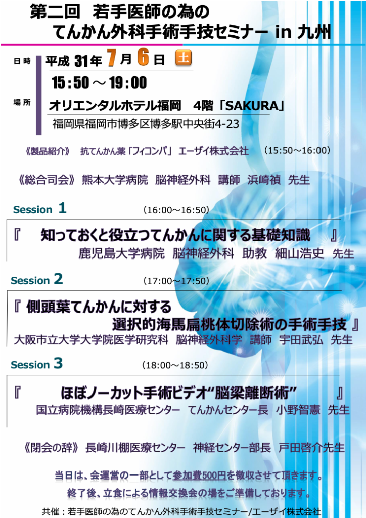 第二回若手医師の為のてんかん外科手術手技セミナー in 九州 2019年6月12日 に Takehiro Uda が投稿 2019年7月6日に、オリエンタルホテル福岡にて「第二回若手医師の為のてんかん外科手術手技セミナー in 九州」が開催されました。Session2として、側頭葉てんかんに対する選択的海馬扁桃体切除術の手術手技」という題目を担当させていただきました。Session1では細山先生に、てんかん診療の基本について丁寧に教えていただき、Session3では普段の学会では、なかなかじっくり見ることのできない脳梁離断術のビデオをみせていただきました。大変勉強になりました。 Tweet