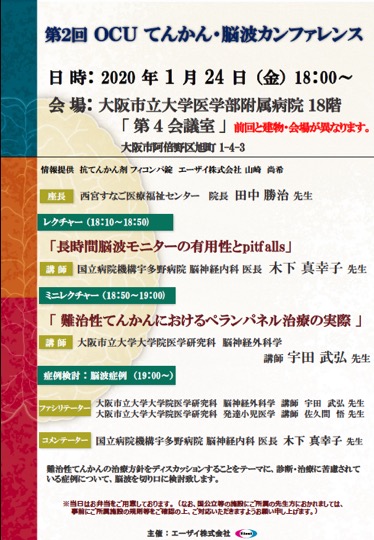 第二回OCUてんかん・脳波カンファレンス 2019年12月25日 に Takehiro Uda が投稿 2020年1月24日に、大阪市立大学医学部附属病院にて「第二回OCUてんかん・脳波カンファレンス」が開催されました。「難治性てんかんにおけるペランパネル治療の実際」の題名でミニレクチャーをさせていただきました。 Tweet