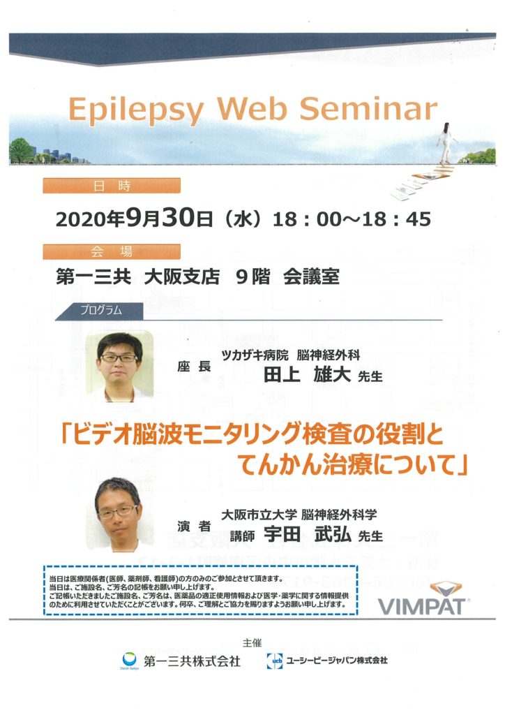 Epilepsy Web seminar 2020年9月14日 に Takehiro Uda が投稿 2020年9月30日に、Epilepsy Web Seminarが開催されました。「ビデオ脳波モニタリング検査の役割とてんかん治療について」と第したWeb seminarを担当させていただきました。田上先生に座長をしていただきました。先生方のみならず、看護師、生理検査技師、薬剤師の方々にも聴講していただいたとお聞きしていました。 Tweet