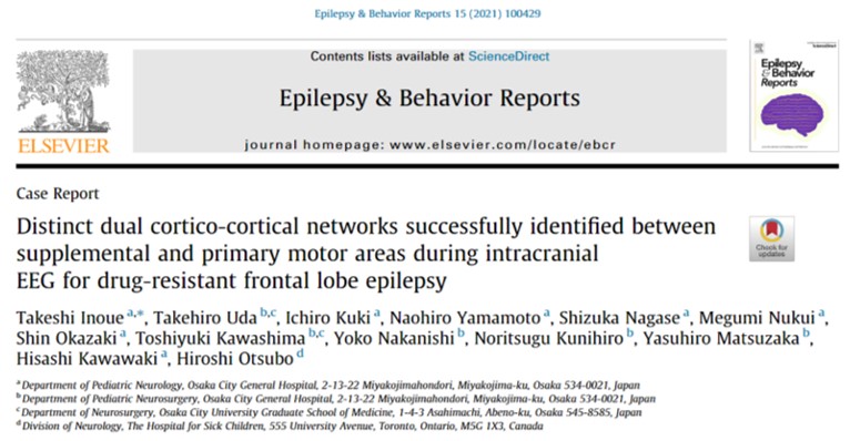 Epilepsy and behavior reportsという英文雑誌に、大阪市立総合医療センターの井上岳司先生らによる「Distinct dual cortico-cortical networks successfully identified between supplemental and primary motor areas during intracranial EEG for drug-resistant frontal lobe epilepsy」と題した論文が掲載されました。光栄な事に私も共著者に名前をつらねていただきました。