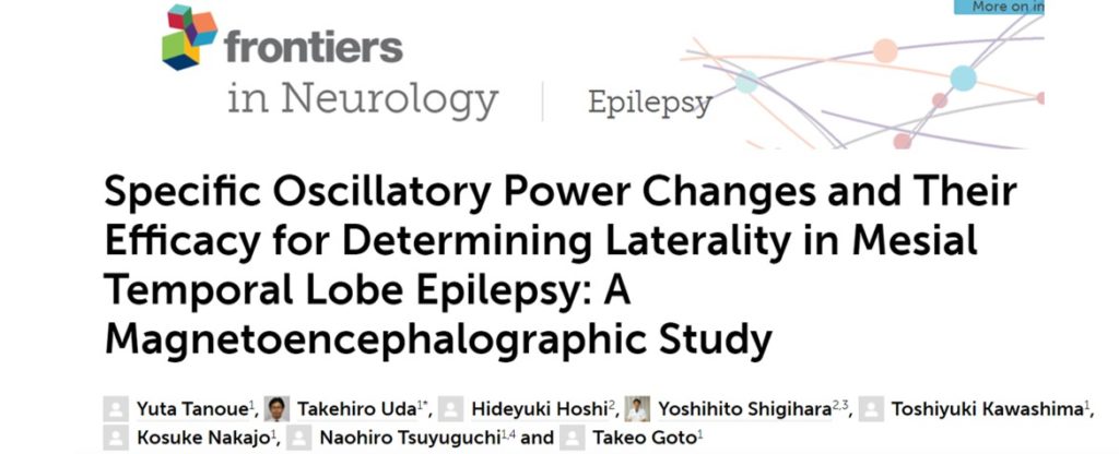 Frontiers in Neurologyという英文雑誌に、田上雄大先生らによる「Specific oscillatory power changes and their efficacy for determining laterality in mesial temporal lobe epilepsy: A magnetoencephalographic study」と題した論文が掲載されました。側頭葉てんかんにおける脳磁図の周波数特性を確立し、側方性の診断への有用性を示した論文です。共著の皆様のご指導のおかげ様で、このような結果を報告することができました。