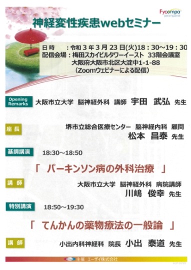 神経変性疾患webセミナー 2021年3月20日 に Takehiro Uda が投稿 2021年3月23日に、Web形式にて「神経変性疾患webセミナー」が開催されました。松本昌泰先生に座長をしていただき、「パーキンソン病の外科治療」について、川嶋俊幸先生に基調講演をいただいた後、「てんかんの薬物治療の一般論」と題して小出泰道先生に、特別講演をいただきました。私はオープニングリマークスを担当させていただきました。 Tweet