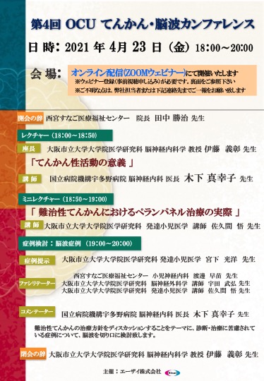 第4回 OCUてんかん・脳波カンファレンス 2021年4月8日 に Takehiro Uda が投稿 2021年4月23日に、第4回 OCUてんかん・脳波カンファレンスが開催されました。「てんかん性活動の意義」「難治性てんかんにおけるぺランパネル治療の実際」の題目で木下先生からレクチャーを拝聴した後、症例呈示がありました。私は、渡邊早苗先生、佐久間悟先生とともに、ファシリテーターを務めさせていただきました。 Tweet