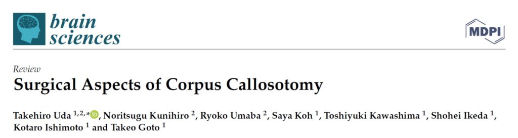 論文掲載「Surgical Aspects of Corpus Callosotomy」 2021年12月5日 に Takehiro Uda が投稿 Brain Sciencesという英文雑誌に、「Surgical Aspects of Corpus Callosotomy」と題したReview論文が掲載されました。てんかんの緩和的外科手術である脳梁離断術の手術手技について自分の言葉でまとめてみました。 Tweet