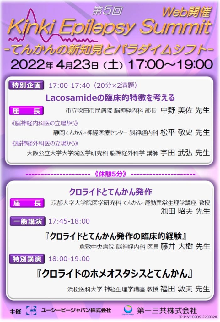 第5回 Kinki Epilepsy Summit 2022年3月10日 に Takehiro Uda が投稿 2022年4月23日に、Web形式にて「第5回 Kinki Epilepsy Summit」が開催されました。中野美佐先生に座長をしていただき、「Lacosamideの臨床的特徴を考えるー脳神経外科医の立場から」と題した演題を発表させていただきました。 Tweet