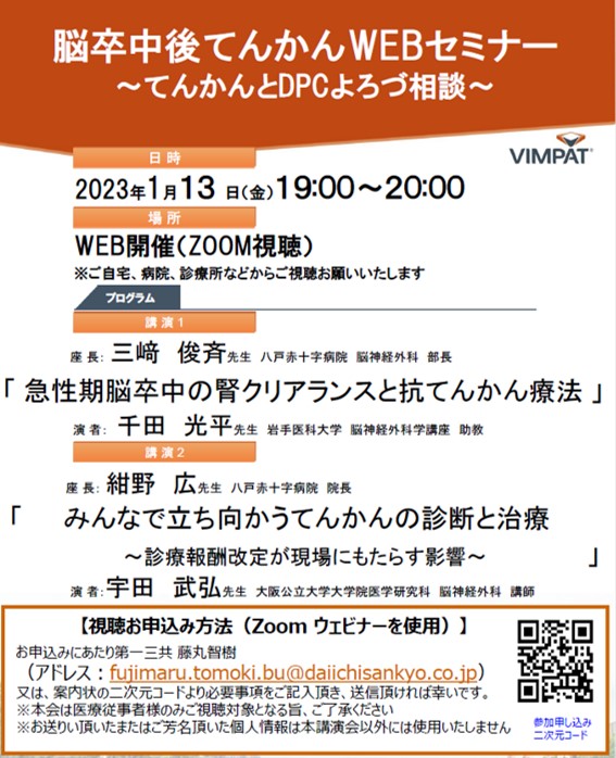 脳卒中後てんかんWEBセミナー 2022年12月17日 に Takehiro Uda が投稿 2023年1月13日に、「脳卒中後てんかんWEBセミナー」が開催されました。講演2として、「みんなで立ち向かうてんかんの診断と治療」についてお話させていただきました。 Tweet