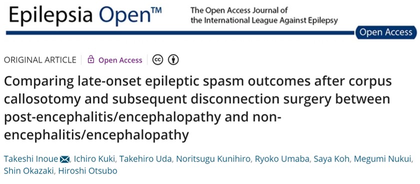 「Comparing late-onset epileptic spasm outcomes after corpus callosotomy and subsequent disconnection surgery between post-encephalitis/encephalopathy and non-encephalitis/encephalopathy」と題した論文がEpilepsia Openという英文雑誌に掲載されました。光栄なことに、私も共同著者にいれていただきました。