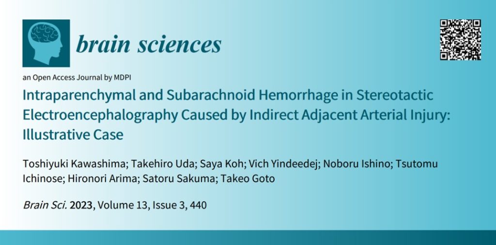 論文掲載「Intraparenchymal and Subarachnoid Hemorrhage in Stereotactic Electroencephalography Caused by Indirect Adjacent Arterial Injury: Illustrative Case」 2023年3月4日 に Takehiro Uda が投稿 「Intraparenchymal and Subarachnoid Hemorrhage in Stereotactic Electroencephalography Caused by Indirect Adjacent Arterial Injury: Illustrative Case」と題した論文がBrain Sciencesという英文雑誌に掲載されました。SEEGの重大な側面について述べたケースレポートです。 Tweet