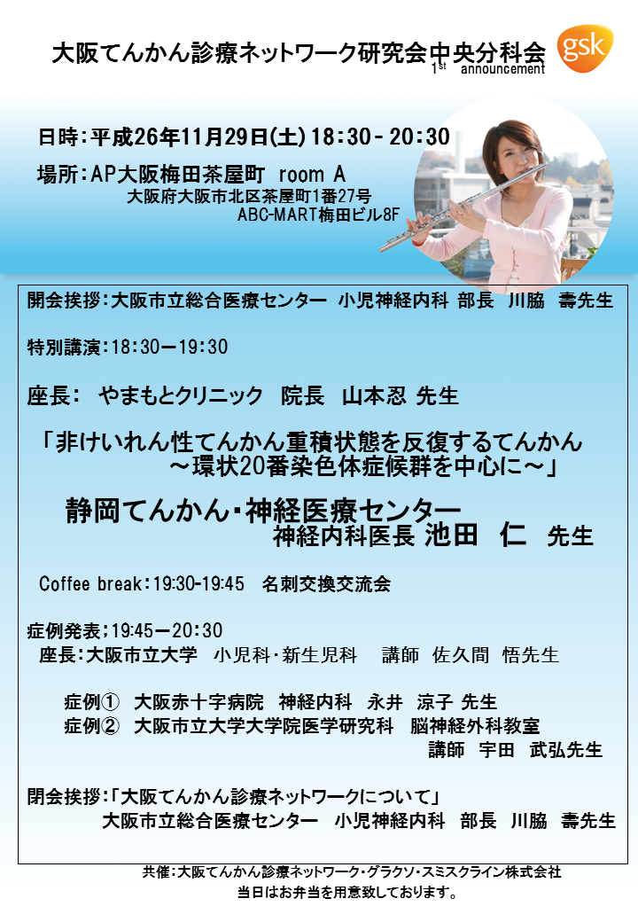 症例発表のお知らせ 2014年11月18日 に Takehiro Uda が投稿 11月29日に、AP大阪梅田茶屋町で行われる「大阪てんかん診療ネットワーク研究会中央分科会」にて、症例発表を行います。演題名は、「外傷性てんかんに対する外科手術」です。外傷後の焦点切除施行例とVNS施行例について発表する予定です。 Tweet